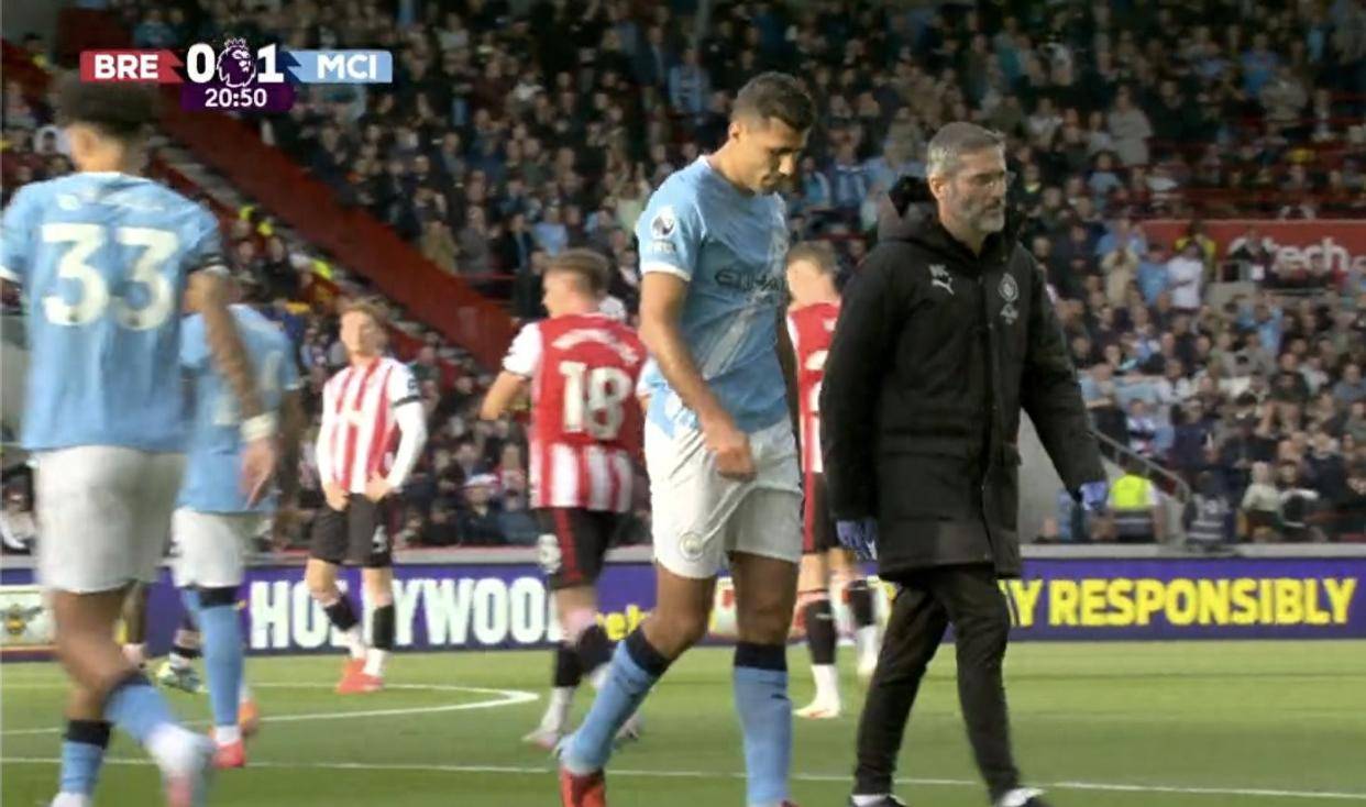 事情发生在布伦特福德的一个社区球场。当时比赛进行到一半,曼城的球员主动把球踢出界,让队医进去处理罗德里的伤情。罗德里坐在地上,一脸痛苦地检查自己的伤势,不停地摇头,几乎要哭出来,明显知道自己可能撑不下去了。